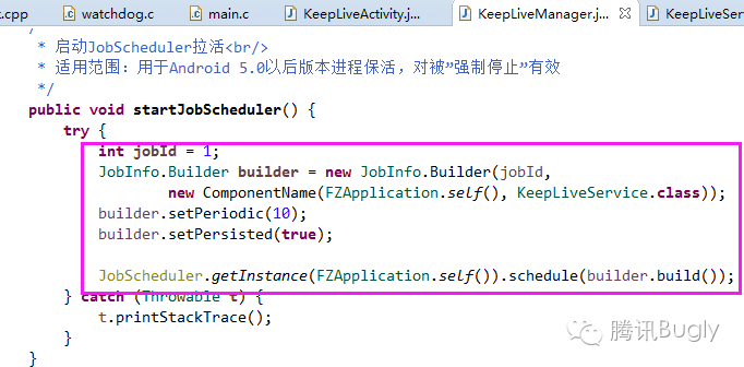 Android5.0 以后系统对 Native 进程等加强了管理,Native 拉活方式失效。系统在 Android5.0 以上版本提供了 JobScheduler 接口,系统会定时调用该进程以使应用进行一些逻辑操作。