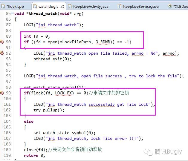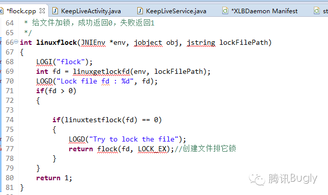 在主进程中创建一个监控文件,并且在主进程中持有文件锁。在拉活进程启动后申请文件锁将会被堵塞,一旦可以成功获取到锁,说明主进程挂掉,即可进行拉活。由于 Android 中的应用都运行于虚拟机之上,Java 层的文件锁与 Linux 层的文件锁是不同的,要实现该功能需要封装 Linux 层的文件锁供上层调用。