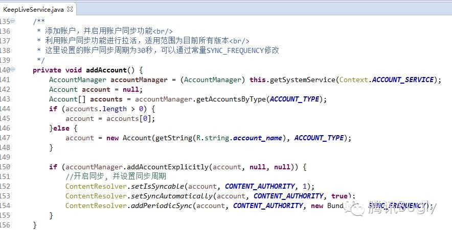 Android 系统的账号同步机制会定期同步账号进行,该方案目的在于利用同步机制进行进程的拉活。添加账号和设置同步周期的代码如下: